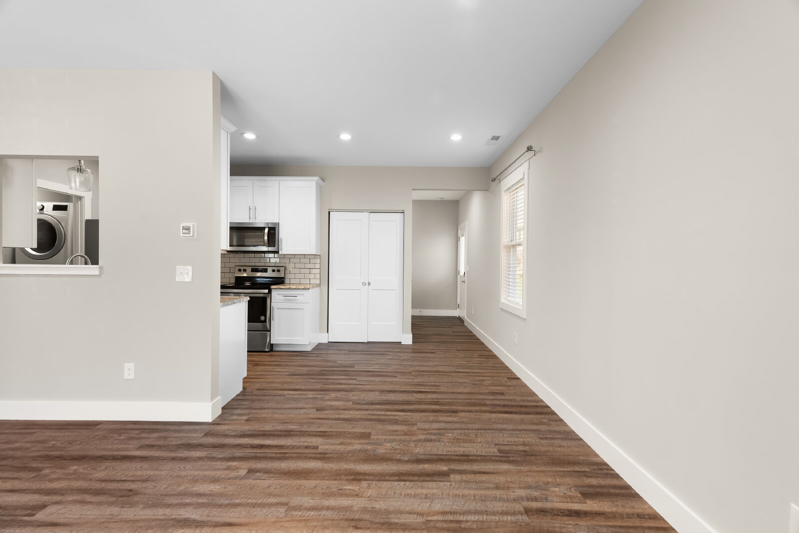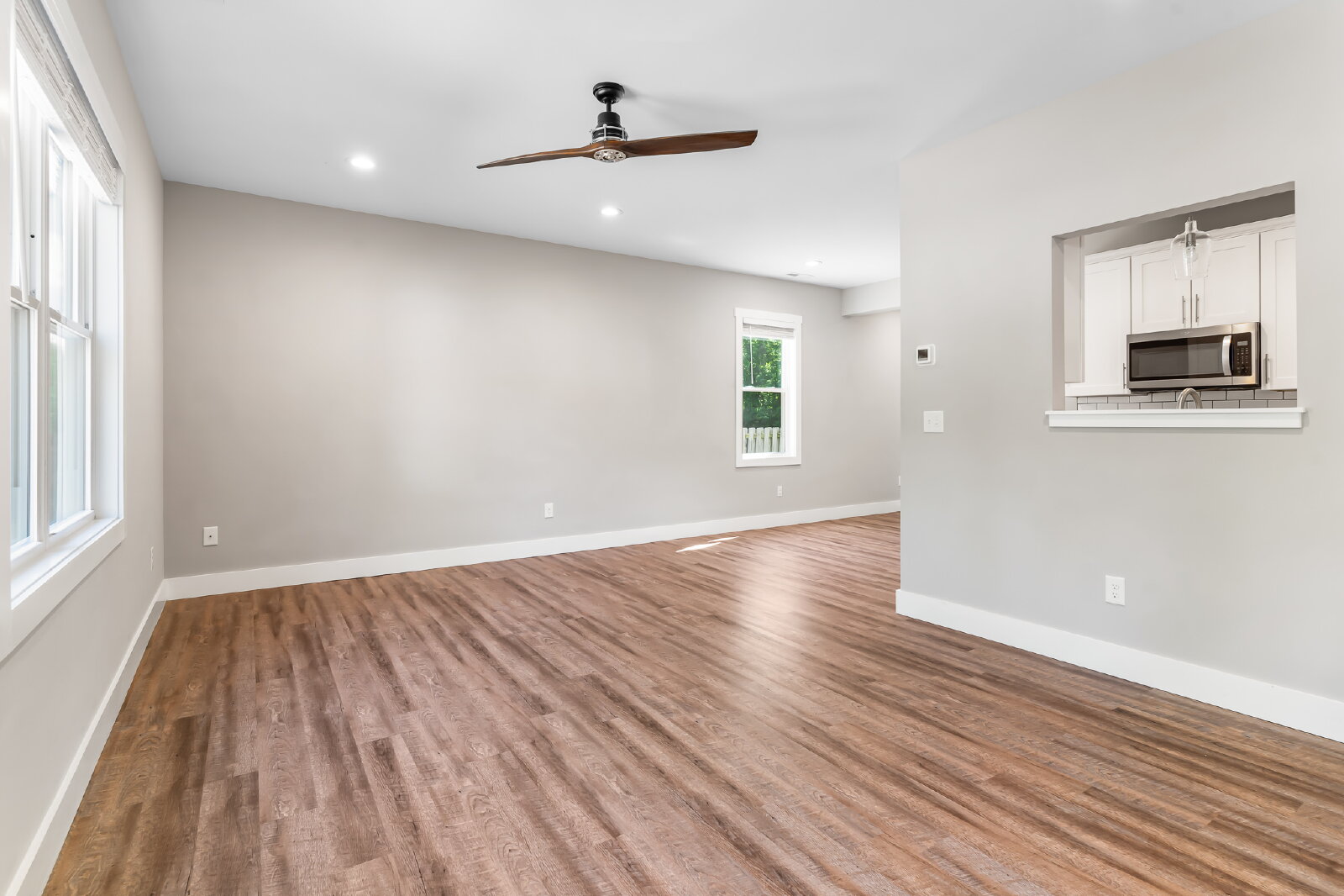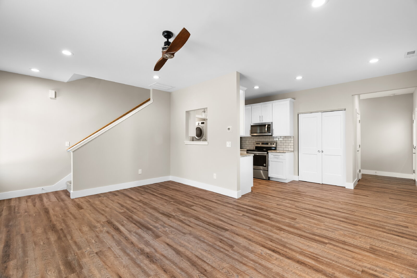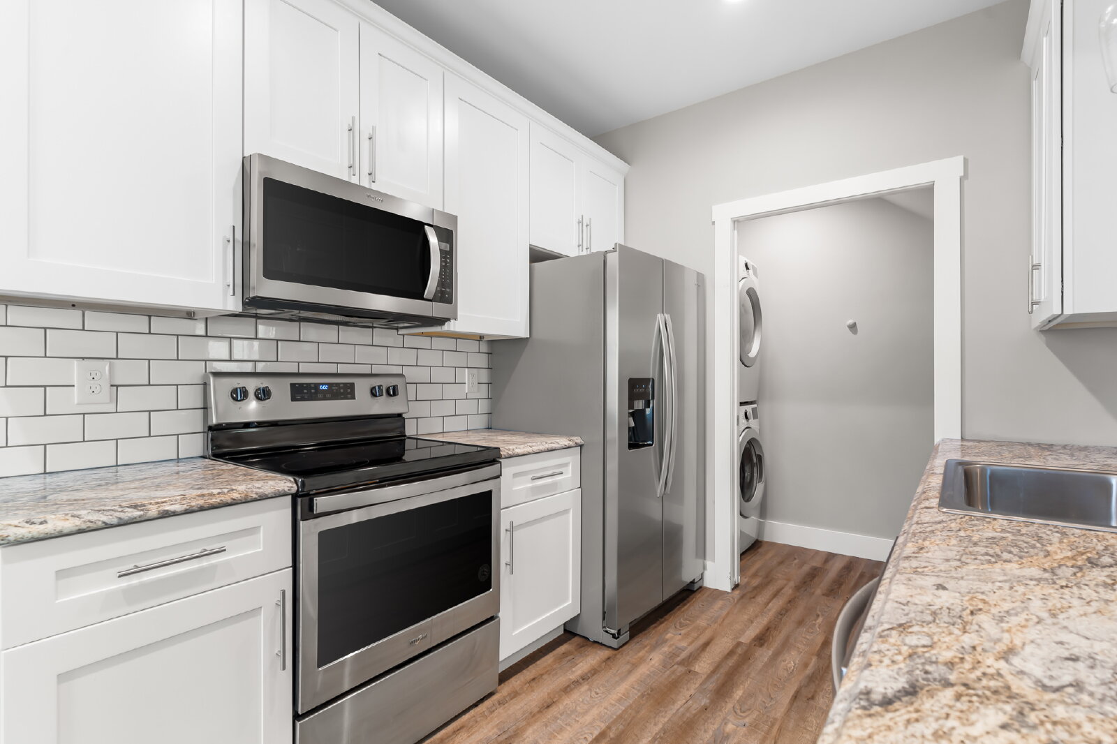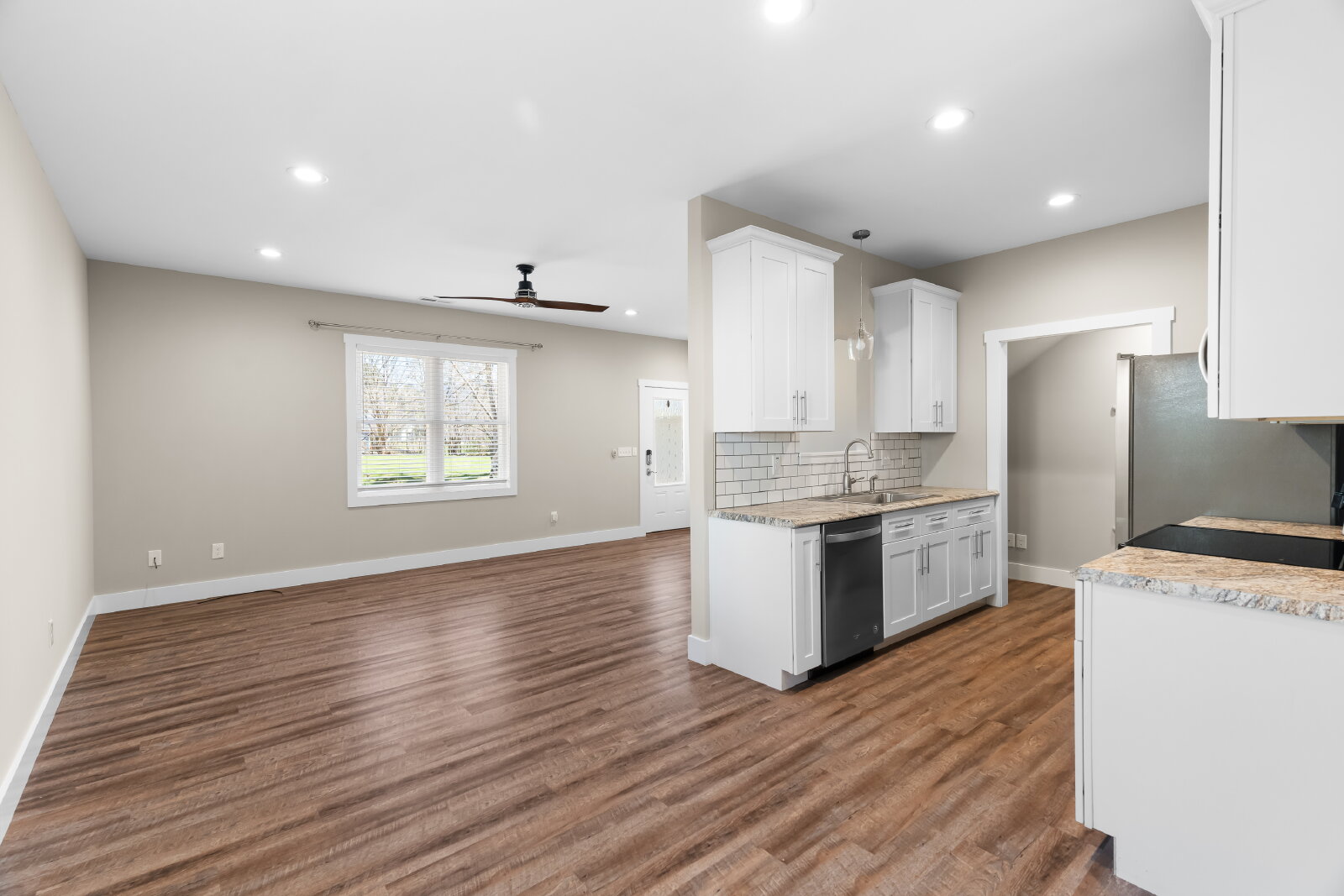 --> Modern Finishes: Luxury vinyl plank flooring flows through the open-concept living areas, complemented by cozy carpeted bedrooms.
