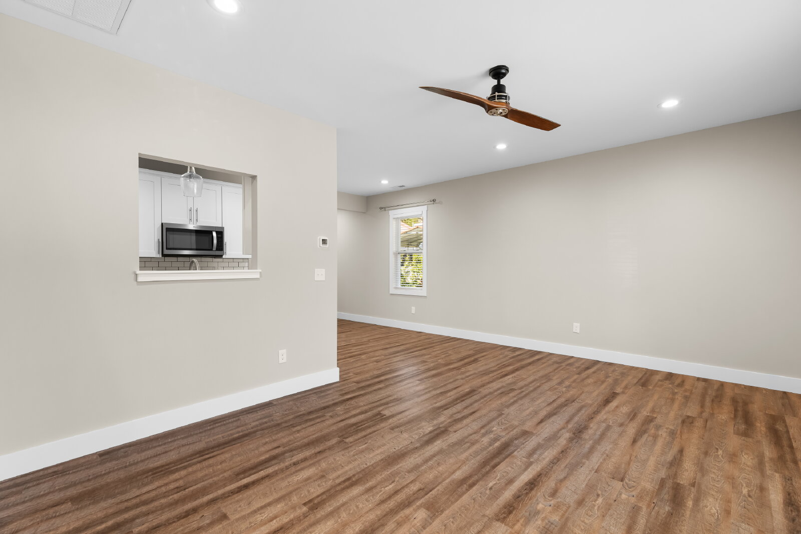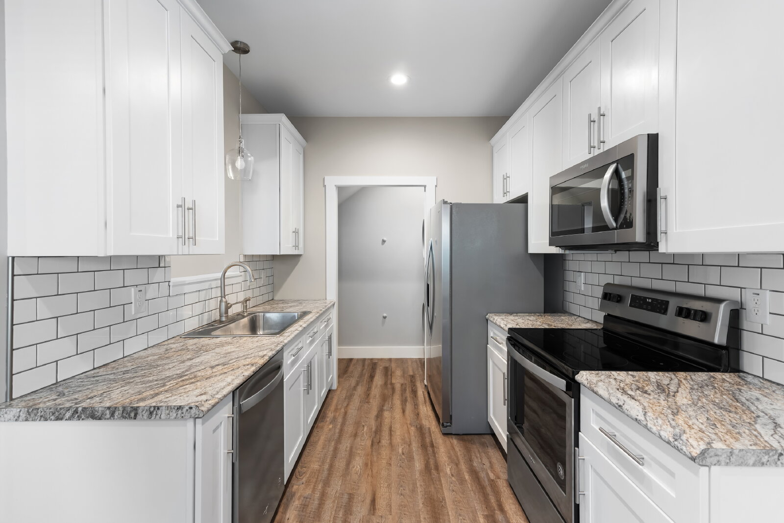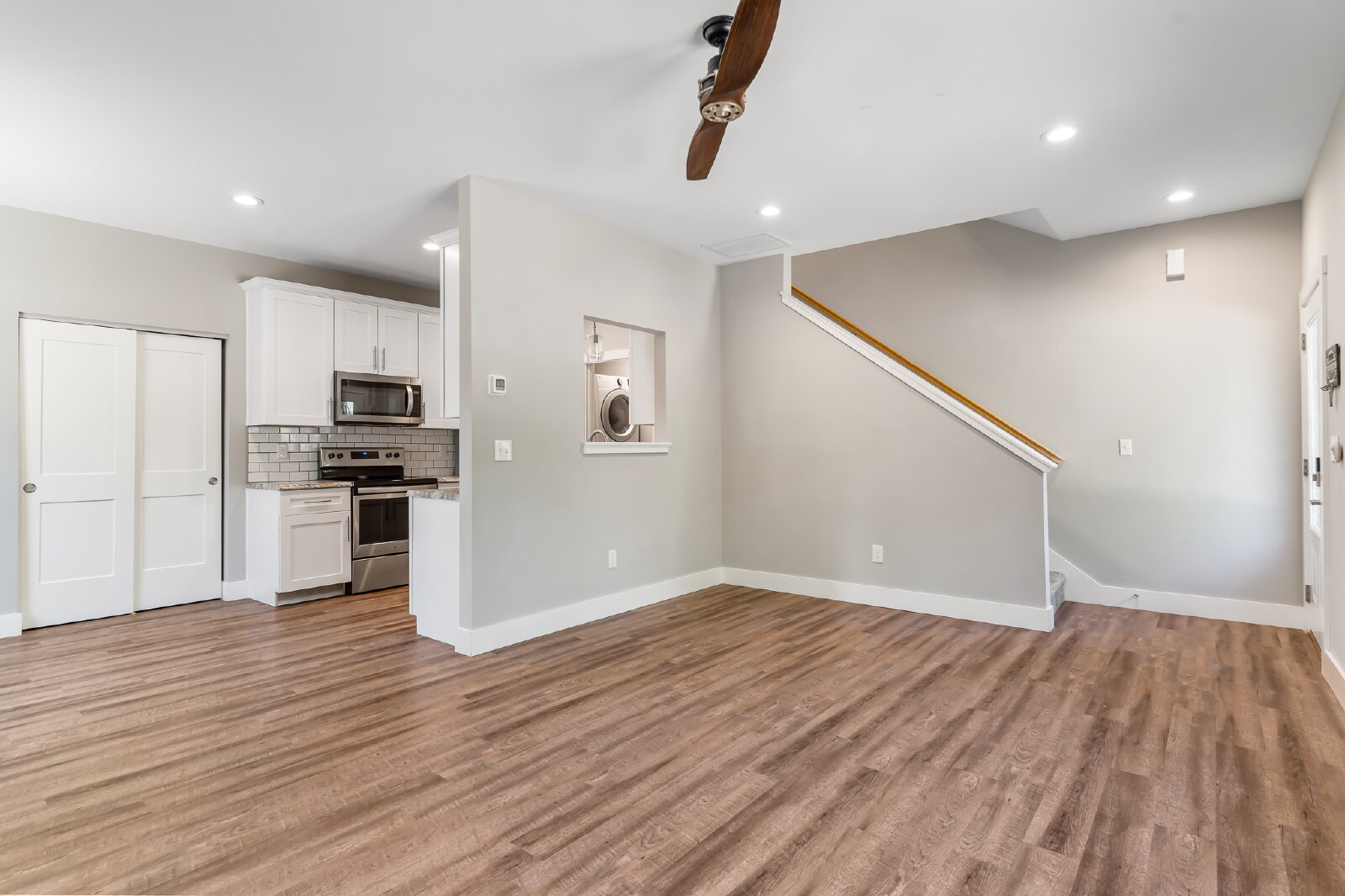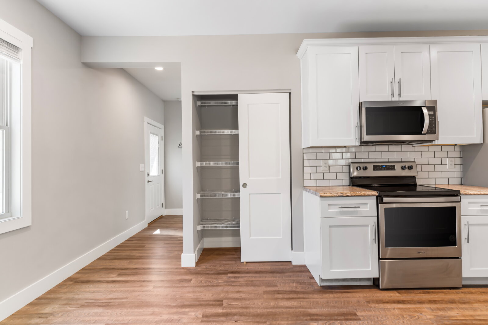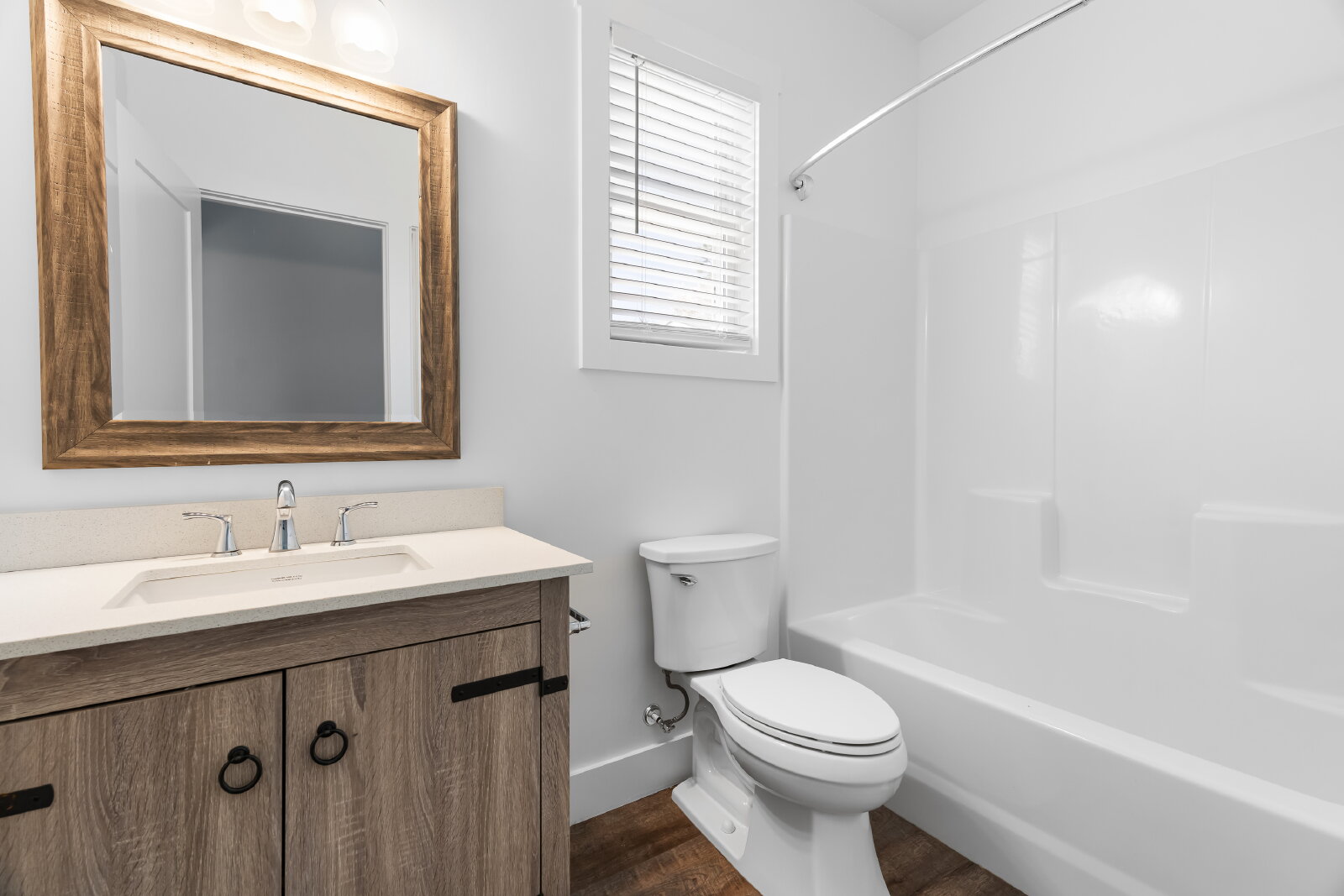 --> Modern Finishes: Luxury vinyl plank flooring flows through the open-concept living areas, complemented by cozy carpeted bedrooms.
