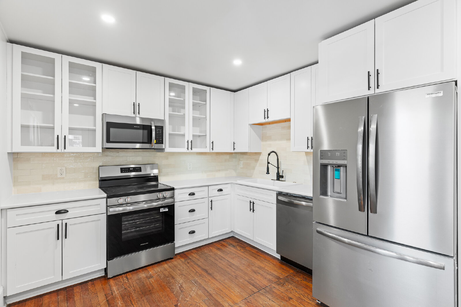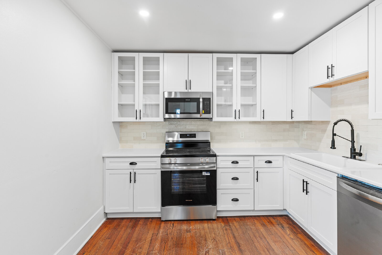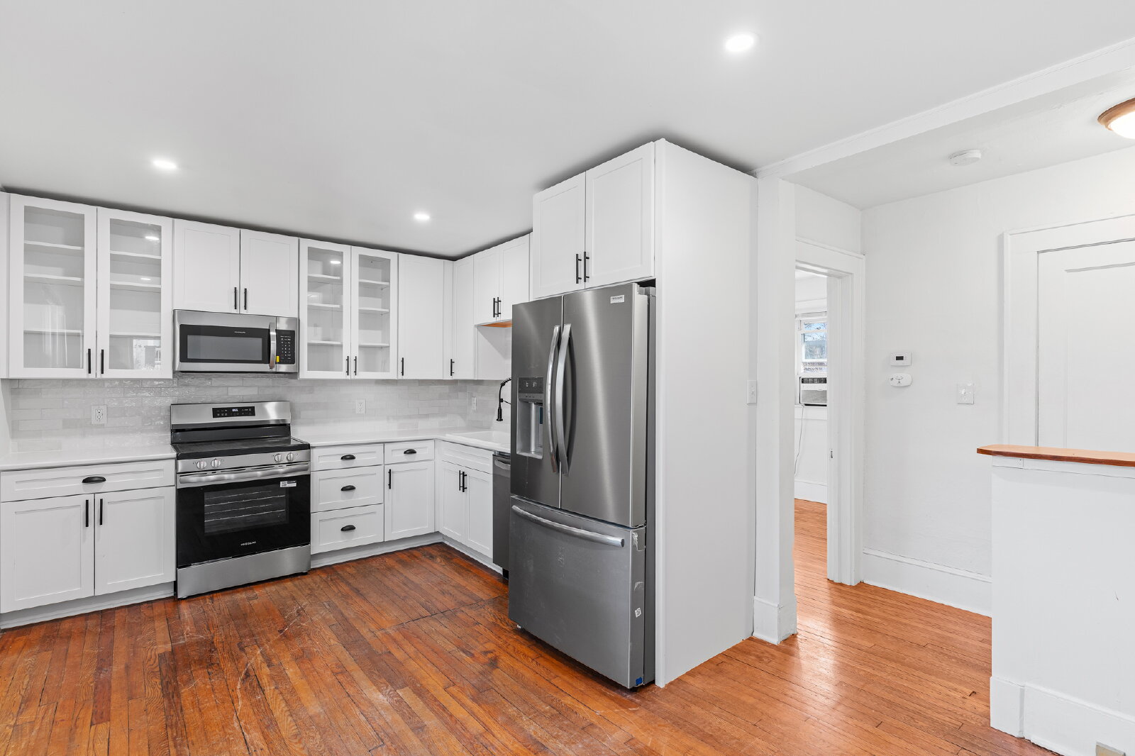 --> Kitchen & Appliances: Electric range, refrigerator, dishwasher, and microwave.